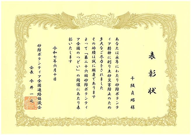 当社西日本営業部の千阪貞昭が、「第26回 砂防ボランティア全国のつどい」において、砂防ボランティア全国連絡協議会功労者表彰受賞し、6月10日に表彰されました。